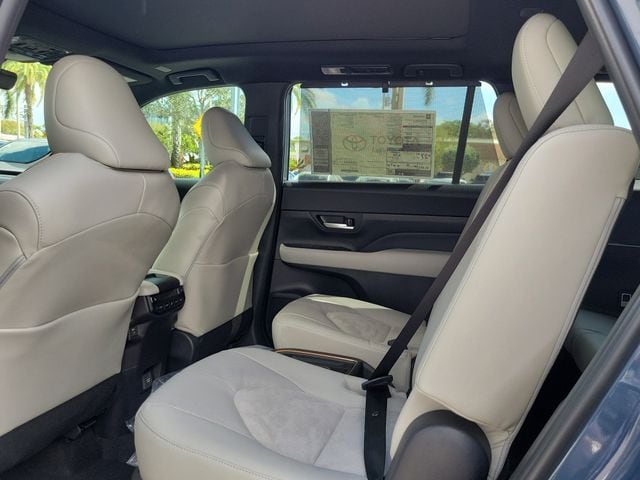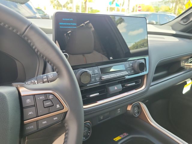 2.4L 4-Cylinder, 11 Speakers, 3rd row seats: split-bench, 4-Wheel Disc Brakes, ABS brakes, Air Conditioning, Alloy wheels, AM/FM radio: SiriusXM, Apple CarPlay/Android Auto, Auto High-beam Headlights, Auto-dimming Rear-View mirror, Automatic temperature control, Brake assist, Bumpers: body-color, Delay-off headlights, Driver door bin, Driver vanity mirror, Dual front impact airbags, Dual front side impact airbags, Electronic Stability Control, Emergency communication system: Safety Connect (up to 10-year trial subscription), Exterior Parking Camera Rear, Four wheel independent suspension, Front anti-roll bar, Front Bucket Seats, Front Center Armrest, Front dual zone A/C, Front fog lights, Front reading lights, Fully automatic headlights, Garage door transmitter: HomeLink, Heated and Ventilated Front Seats, Heated door mirrors, Heated front seats, Heated rear seats, Heated steering wheel, Illuminated entry, Knee airbag, Leather Shift Knob, Leather steering wheel, Low tire pressure warning, Memory seat, Navigation system: Drive Connect Cloud Navigation (1-year trial subscription), Occupant sensing airbag, Outside temperature display, Overhead airbag, Overhead console, Panic alarm, Passenger door bin, Passenger vanity mirror, Power door mirrors, Power driver seat, Power Liftgate, Power passenger seat, Power steering, Power windows, Radio: 12.3" Toyota Audio Multimedia with JBL Audio, Rain sensing wipers, Rear air conditioning, Rear anti-roll bar, Rear reading lights, Rear window defroster, Rear window wiper, Reclining 3rd row seat, Remote keyless entry, Security system, Speed control, Speed-sensing steering, Split folding rear seat, Spoiler, Steering wheel mounted audio controls, Telescoping steering wheel, Tilt steering wheel, Traction control, Trip computer, Turn signal indicator mirrors, Ultrasuede/Leather Seat Trim, Variably intermittent wipers, Ventilated front seats, and Wheels: 20" 2-Tone Multi-Spoke Aluminum.