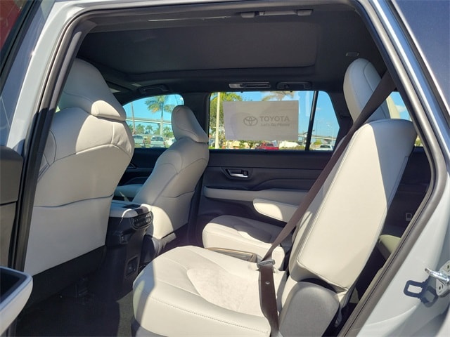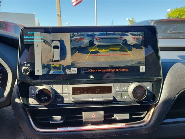 2.4L 4-Cylinder, 11 Speakers, 3rd row seats: split-bench, 4-Wheel Disc Brakes, ABS brakes, Air Conditioning, Alloy wheels, AM/FM radio: SiriusXM, Apple CarPlay/Android Auto, Auto High-beam Headlights, Auto-dimming Rear-View mirror, Automatic temperature control, Brake assist, Bumpers: body-color, Delay-off headlights, Driver door bin, Driver vanity mirror, Dual front impact airbags, Dual front side impact airbags, Electronic Stability Control, Emergency communication system: Safety Connect (up to 10-year trial subscription), Exterior Parking Camera Rear, Four wheel independent suspension, Front anti-roll bar, Front Bucket Seats, Front Center Armrest, Front dual zone A/C, Front fog lights, Front reading lights, Fully automatic headlights, Garage door transmitter: HomeLink, Heads-Up Display, Heated and Ventilated Front Seats, Heated door mirrors, Heated front seats, Heated rear seats, Heated steering wheel, Illuminated entry, Knee airbag, Leather Shift Knob, Leather steering wheel, Low tire pressure warning, Memory seat, Navigation system: Drive Connect Cloud Navigation (1-year trial subscription), Occupant sensing airbag, Outside temperature display, Overhead airbag, Overhead console, Panic alarm, Passenger door bin, Passenger vanity mirror, Power door mirrors, Power driver seat, Power Liftgate, Power moonroof, Power passenger seat, Power steering, Power windows, Radio: 12.3" Toyota Audio Multimedia with JBL Audio, Rain sensing wipers, Rear air conditioning, Rear anti-roll bar, Rear reading lights, Rear window defroster, Rear window wiper, Reclining 3rd row seat, Remote keyless entry, Security system, Speed control, Speed-sensing steering, Split folding rear seat, Spoiler, Steering wheel mounted audio controls, Telescoping steering wheel, Tilt steering wheel, Traction control, Trip computer, Turn signal indicator mirrors, Ultrasuede/Leather Seat Trim, Variably intermittent wipers, Ventilated front seats, Ventilated rear seats, and Wheels: 20" 2-Tone Multi-Spoke Aluminum.